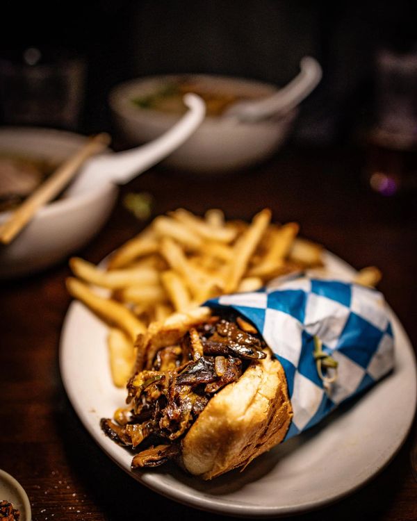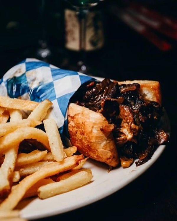 our house marinated mushrooms sautéed with peppers, onions and cheese, on a hoagie