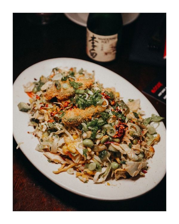 edamame, crispy noodles, lettuce, cabbage, scallions, corn, avocado, cucumber, egg, chili garlic crunch, garlic, cilantro, basil, tahini ginger dressing