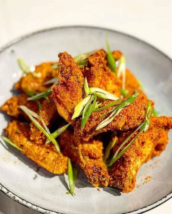 pork and scallion stuffed dumplings, chili ginger sauce, scallion, fried garlic